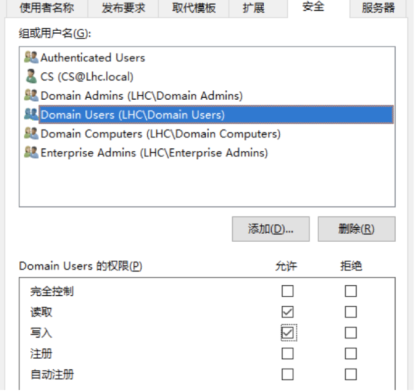 表示允许 Active Directory 中任何经过身份验证的用户请求基于此证书模板生成的新证书