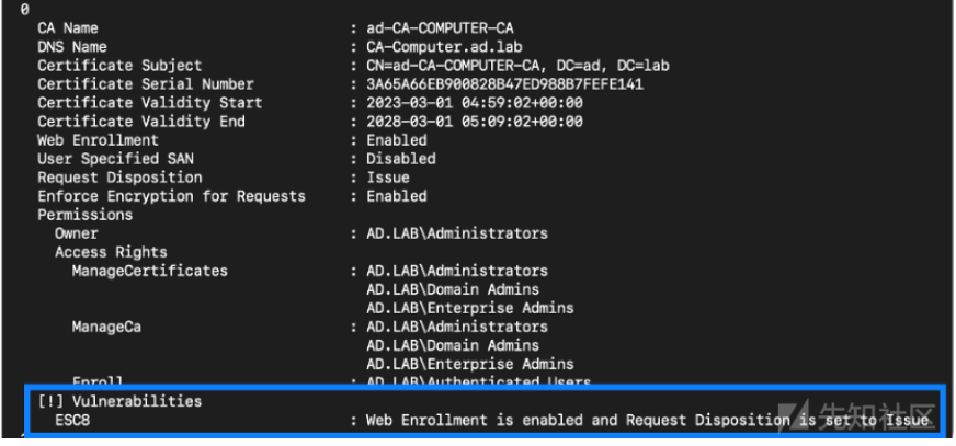 使用certipy查看可利用的漏洞,域内还可以使用certifykit和ADCSpwn: